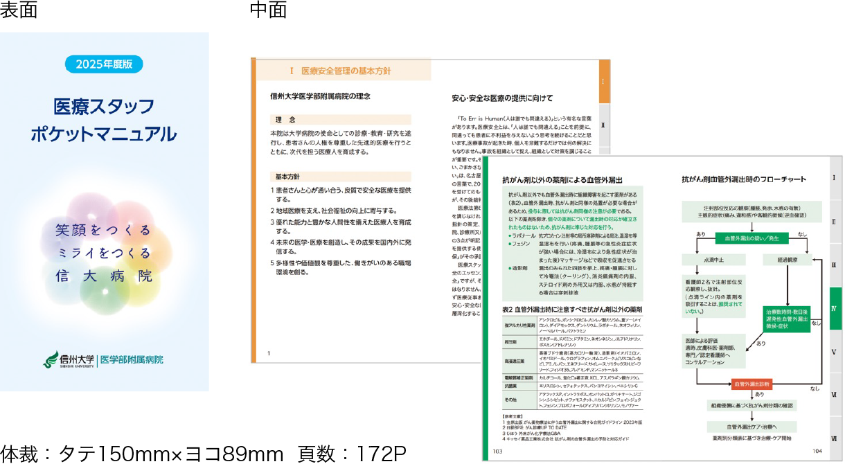医療機関の多くが、職員に携帯を義務づけているポケットサイズの医療安全マニュアル。医療安全に関する情報がまとめられたもので、コンパクトながら重みのある冊子です。縁あって、信州大学医学部附属病院のマニュアル(2025年版)を制作させていただいたのでご紹介します。